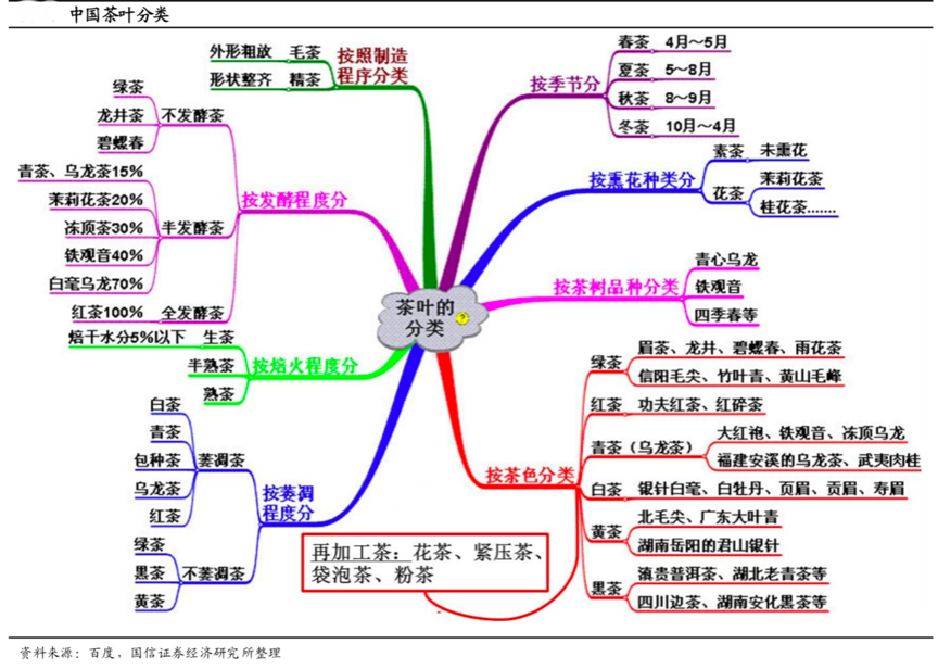 茶葉的多樣性及多分類依然存在,多類型多檔次茶葉引領(lǐng)著“多元化茶消費(fèi)”。茶葉種類繁多,根據(jù)國(guó)家最新版《茶葉分類》、百度、國(guó)信證券經(jīng)濟(jì)研究所等綜合資訊表明,茶葉可以分為七大類,包括綠茶、紅茶等。同時(shí),茶葉中含有茶多酚、茶多糖、茶氨基、維生 素和礦物質(zhì)等,具備提神醒腦、助消化、抗氧化、降血壓等功能;茶葉消費(fèi)也多圍繞著其功能價(jià)值、口味價(jià)值等展開。