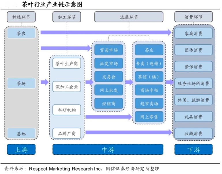 茶葉產(chǎn)品的“產(chǎn)業(yè)鏈經(jīng)營(yíng)特征”明顯,“產(chǎn)品為王 價(jià)值點(diǎn)亮 服務(wù)增值”成為茶產(chǎn)業(yè)發(fā)展的關(guān)鍵詞。根據(jù)Respect Marketing Research Inc、國(guó)信證券經(jīng)濟(jì)研究所等綜合資訊表明,茶葉品牌經(jīng)營(yíng)需要依托于“茶產(chǎn)業(yè)鏈”來推進(jìn),茶葉行業(yè)包括上游的種植環(huán)節(jié),中游的加工、流通環(huán)節(jié),以及下游的消費(fèi)環(huán)節(jié),茶葉不僅可以直接供消費(fèi)者飲用,還可以通過深加工制成速溶茶、 茶飲料、茶食品、茶保健品和茶日化品等。“產(chǎn)品為王”依托于茶產(chǎn)業(yè)鏈的高效運(yùn)轉(zhuǎn),“價(jià)值點(diǎn)亮”需要茶企關(guān)注茶葉品牌的價(jià)值塑造、檔次升級(jí)及溢價(jià)支撐等,而“服務(wù)增值”則提醒茶企圍繞“茶葉交易及消費(fèi)”構(gòu)建全方位的品牌化服務(wù)體系,關(guān)注品牌化交易場(chǎng)景及“個(gè)性化茶消費(fèi)體驗(yàn)”。