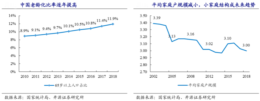 “老齡社會”逐漸形成,“泛生活精品品類”倍受追捧。從國內數據看,老齡人口比例逐年上升、出生人口率下降,我國已逐漸步入老齡化社會。根據國家統計局、開源證券研究所等綜合資訊表明,2018年我國平均家庭戶規模為3.00 人,近年來持續下滑,小家庭結構將成為未來家庭結構的趨勢。大賣場、超市等傳統大業態的購物流量受到攔截,而以便利店或社區生鮮店為典型、滿足消費者一日三餐需求為目標的社區化中小業態將得到更大的發展機會。