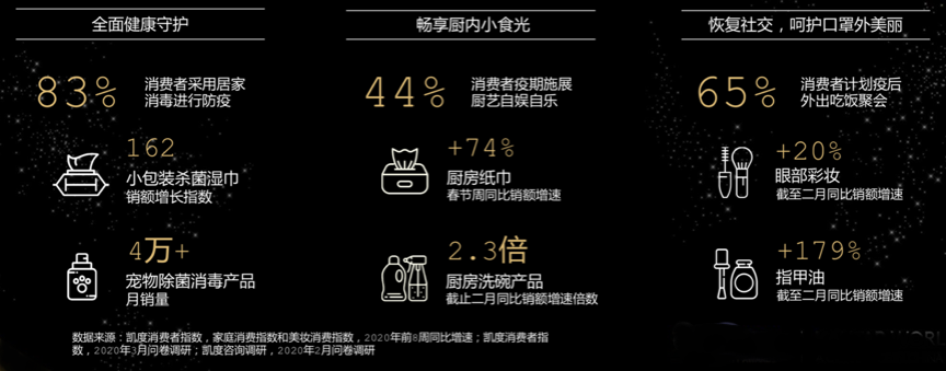 放大“健康性品質類”快速品需求,健康商品、健康消費和品質消費。根據凱度消費者指數、家庭消費指數和美妝消費指數等綜合資訊表明,疫情帶給我們的,除了消毒用品、家庭清潔用品等健康消費的提升,更加快了民眾普遍關心的商品可靠、健康商品及健康消費的品牌策劃營銷宣傳,通過線上科普教育、社群交流、內容種草、活動激發等提升用戶的品牌認同感。