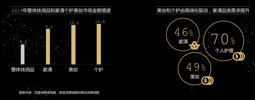 疫情帶給國內品類消費的改變,在于其極大提升了公眾對“健康品類”的消費認知,自然的、健康的、高品質的商品倍受關注,品質化、高端化等特色性品類消費大有增長。根據凱度消費者指數、家庭消費指數和美妝消費指數等綜合資訊表明,美妝個護家清品類領跑整體快速消費品市場,家庭清潔類產品、美妝消費類產品及個人護理類產品等增速高于整體快消品增速,同時美妝、個人護理等品類增長則高端化驅動。