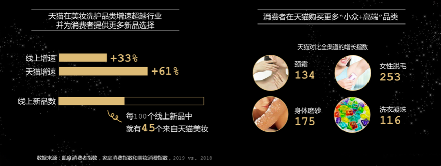 快消品消費具有一定的剛需消費性質,其本身的產品特性突出,產品高端化、品質化和圈層化行銷特性顯著。根據凱度消費者指數、家庭消費指數和美妝消費指數等綜合資訊表明,天貓在美妝洗護品類增速超越行業并為消費者提供更多新品選擇,而消費者在天貓購買更多的“小眾+高端”品類,如頸霜(增長指數134),女性脫毛(增長指數253)等產品。