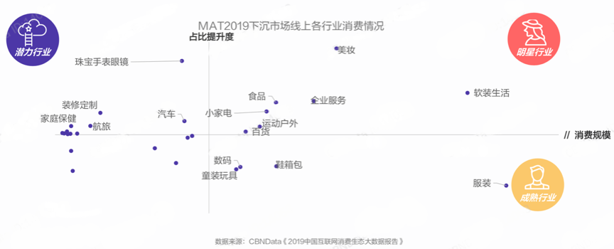 下沉市場(chǎng)的“品質(zhì)消費(fèi)升級(jí)”正當(dāng)時(shí),大量的“內(nèi)容型消費(fèi)”大行其道。根據(jù)CBNData《2019中國(guó)互聯(lián)網(wǎng)消費(fèi)生態(tài)大數(shù)據(jù)報(bào)告》等綜合資訊表明,下沉市場(chǎng)的消費(fèi)結(jié)構(gòu)中,鞋服、數(shù)碼行業(yè)發(fā)展已趨成熟,美妝消費(fèi)主導(dǎo)了一場(chǎng)顏值新風(fēng)潮,成為下沉市場(chǎng)近一年消費(fèi)占比提升度最大的行業(yè),家居家裝、食品日化行業(yè)等正快速發(fā)展中。