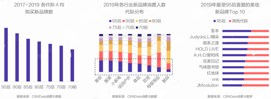 “高顏值、高個(gè)性化”是“明星品牌”及明星產(chǎn)品打造的“典型特征”之一,更是企業(yè)征伐市場(chǎng)的利器。根據(jù)CBN Data《2019中國(guó)互聯(lián)網(wǎng)消費(fèi)生態(tài)大數(shù)據(jù)報(bào)告》等綜合資訊表明,在新品牌購(gòu)買數(shù)量上,越年輕的消費(fèi)者購(gòu)買的新品牌數(shù)量越多,體現(xiàn)出年輕消費(fèi)力對(duì)新品牌強(qiáng)烈的好奇心;服裝、美妝為90后和95后消費(fèi)者占比最高的兩個(gè)行業(yè),美妝行業(yè)中更受95后追捧的大多為兼具口碑與性價(jià)比的國(guó)貨彩妝。