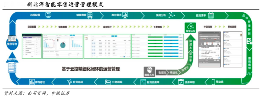 經典案例:根據公司官網、中銀證券等綜合資訊表明,新北洋公司針對不同細分領域和客戶需求,除了提供硬件外,還需要提供一整套的云平臺管理系統,后臺時時監控,并通過大數據分析助力運營商實現高效運營和精準營銷。其獨創了“激光測距+圖像識別”技術,提升設備智能屬性,以及降低貨損率。