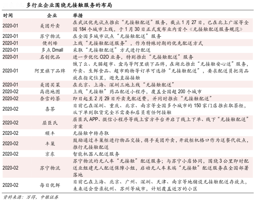 2020年年初的疫情期間,為降低人員面對面接觸風險,“無接觸”服務迅速興起,快遞、外賣、零售等行業趨之若鶩。根據萬得、中銀證券等綜合資訊表明,以美團外賣為代表的外賣企業全力推進“配送革新”,豐巢更是鼓勵通過“豐巢柜”進行物品交接,攜手美團外賣,開放柜機格口作為送餐代收點;京東則推出了“智能機器人配送服務”。國內疫情的發展極大助推了智能設備的網點鋪設和商業場景應用,中國新零售平臺策劃又上了一個“大臺階”。