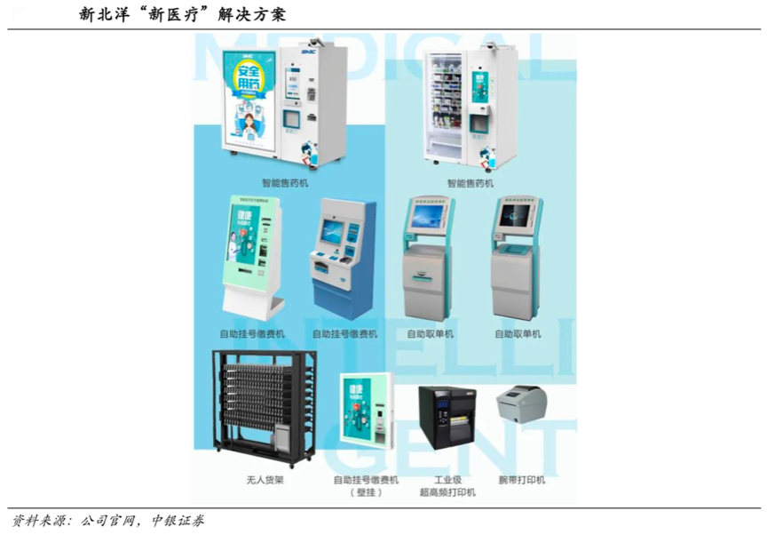 經典案例:根據公司官網、中銀證券等綜合資訊表明,新北洋公司革新了“醫藥新零售”方式,以“24小時無人值守智能售藥柜”為線下載體,線上線下完美融合的創新模式。線上可拓展出遠程問診+無人售藥等多場景售藥的解決方案,線下以“售藥智能設備”解決傳統藥店“經營成本高、獲客成本高、坪效收益低”等痛點,為患者夜間取藥、就近取藥等需求提供便利。