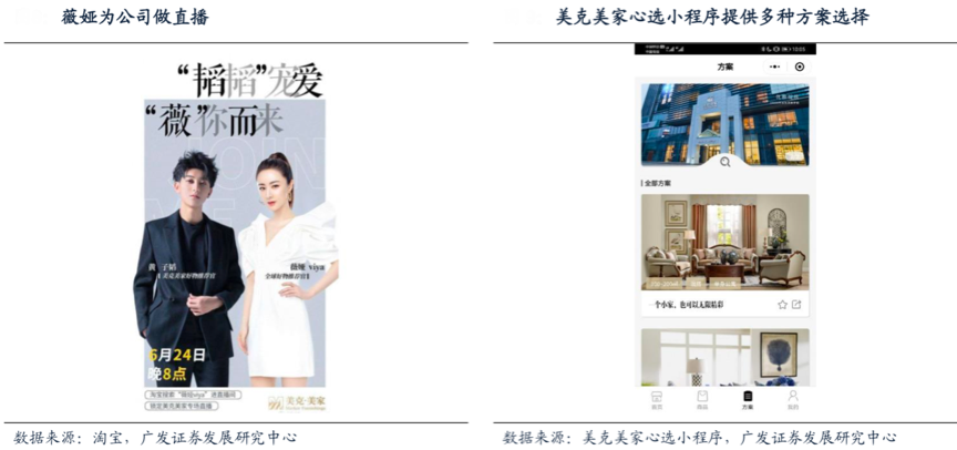 經(jīng)典案例:根據(jù)淘寶、廣發(fā)證券發(fā)展研究中心、美克美家心選小程序等綜合資訊表明,2019年6月24日,美克家居旗下公司美克美家開(kāi)啟“韜韜寵愛(ài),薇你推薦”直播專(zhuān)場(chǎng),其直播參與人數(shù)突破1600萬(wàn),累計(jì)訂單額超1200萬(wàn),“誰(shuí)把家搬進(jìn)薇婭直播間”等熱門(mén)話(huà)題搶占微博熱搜。同時(shí),其利用VR技術(shù)還原真實(shí)門(mén)店場(chǎng)景、布展及商品,消費(fèi)者可通過(guò)移動(dòng)端在線(xiàn)全景逛店瀏覽。2020年3月上線(xiàn)的“美家心選”小程序,“數(shù)字化轉(zhuǎn)型”加快,全渠道品牌資產(chǎn)由此構(gòu)建。