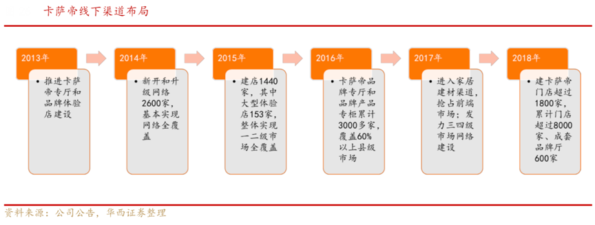 根據公司公告、華西證券整理等綜合資訊表明,截至2018年,公司已累計建成卡薩帝門店 8000 家、卡薩帝成套品牌廳 600 家,而西門子、博世等品牌線下門店數量均不足百家,卡薩帝線下渠道覆蓋密度相較其它高端家電品牌形成絕對領先優勢。