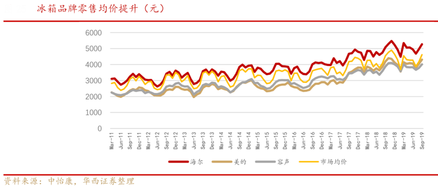 優秀高端冰箱企業宜順應卡薩帝品牌發展及高端家電消費擴容之勢,放大 “自由嵌入式設計”等產品亮點,以次高端品牌、高品質保證、中價格實惠等切入市場,高舉“高性價比”產業大旗,搶奪次高端家電消費市場,占據注重品牌家電消費的“次高端家電”產業空間。根據中怡康、華西證券等綜合資訊顯示,2019年冰箱線下市場高端產品(8000元以上)零售額占比達到29.7%,同比提升1.9pcts,在行業整體銷售額下滑的背景下仍然實現5.4%的正增長。冰箱產品以多門、對開門等為方向的外觀結構升級已經較為充分,未來高端化將圍繞功能、細分市場需求的差異化升級和技術智能化升級等進行突破。