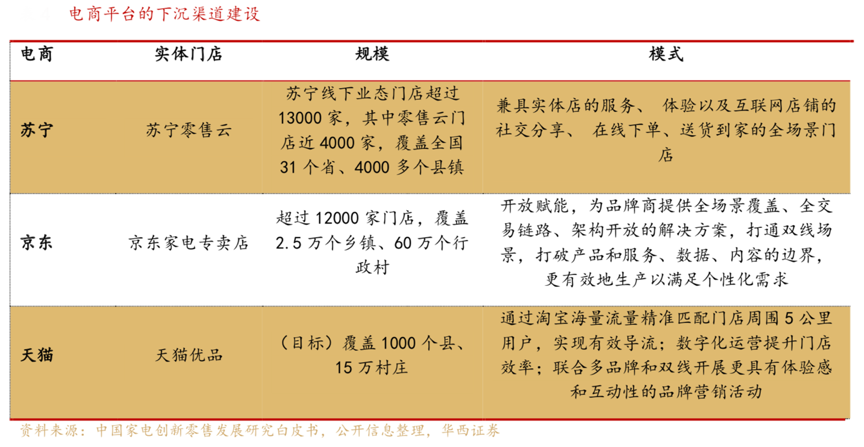 2019 年,四線及以下城市家電消費增長特征最為明顯,家電銷量同比增 長 42.4%,銷售額同比增長 7.2%,四線及以下城市家電銷售 額占比較 2018 年上升 1.1 個百分點,下沉市場家電消費顯著增長。據中國家電創新零售發展研究白皮書、公開信息整理及華西證券等綜合資訊表明,各大電商平臺正在加速推進“電商平臺的政黨渠道建設”,蘇寧依托“蘇寧零售云”、京東做強“京東家電專賣店”、天貓放大“天貓優品”影響力,占據市場競爭優勢。