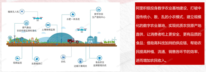 “農(nóng)業(yè)數(shù)字化”驅(qū)動著農(nóng)業(yè)產(chǎn)業(yè)化的步伐,指引著企業(yè)發(fā)展的方向,刷新著農(nóng)業(yè)產(chǎn)業(yè)化的高效產(chǎn)出。根據(jù)中央一號文件指出,要加強現(xiàn)代農(nóng)業(yè)設(shè)施建設(shè),加快物聯(lián)網(wǎng)、大數(shù)據(jù)、區(qū)塊鏈、人工智能、第五代移動通信網(wǎng)絡(luò)、智慧氣象等現(xiàn)代信 息技術(shù)在農(nóng)業(yè)領(lǐng)域的應(yīng)用。同時,根據(jù)阿里研究院《2020阿里農(nóng)產(chǎn)品電商報告》等綜合資訊表明,5G時代來臨、鄉(xiāng)村振興疊加數(shù)字農(nóng)業(yè)相關(guān)政策,將共同助力數(shù)字農(nóng)業(yè)步入快速發(fā)展期,阿里的“數(shù)字農(nóng)業(yè)基地建設(shè)”倍受關(guān)注,農(nóng)產(chǎn)品消費牽引、數(shù)字農(nóng)業(yè)生產(chǎn)加持、農(nóng)業(yè)數(shù)據(jù)大賦能,數(shù)字化農(nóng)業(yè)讓農(nóng)業(yè)產(chǎn)業(yè)化發(fā)展更上一層樓。
