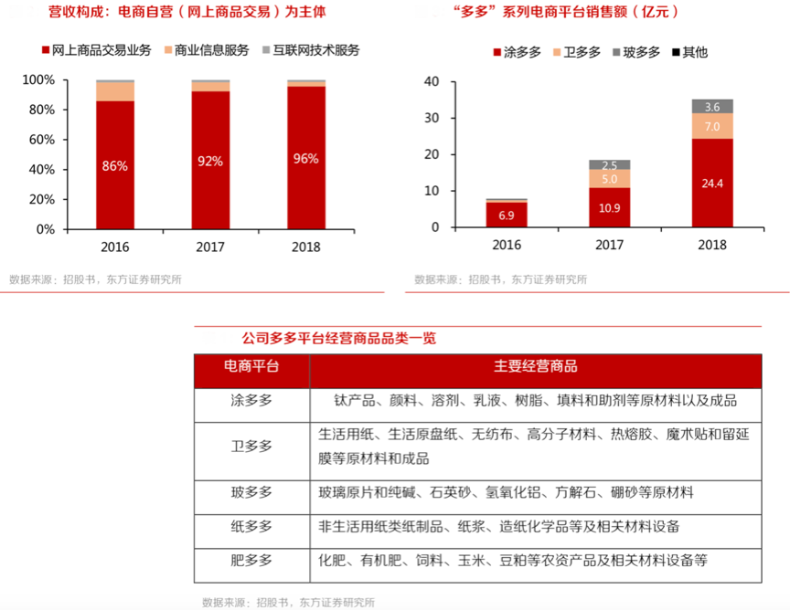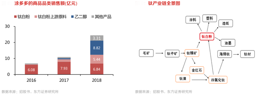 經典案例:根據公司招股書、東方證券研究所等綜合資訊表明,以涂多多為例: 2016年,涂多多商品品類較為單一,鈦白粉占涂多多收入89%;短短2年間,涂多多沿著鈦白粉產業鏈向上延伸,拓展了四氯化鈦、鈦精礦、金紅石、鈦渣等上游原料。橫向角度,涂多多的子平臺“醇多多”迅速發力,乙二醇、甲醇、二甘醇等醇類商品交易額顯著提升,僅乙二醇單個產品就占了涂多多36% 的銷售額。2016-2018年,乙二醇的交易量擴大了 100 倍。