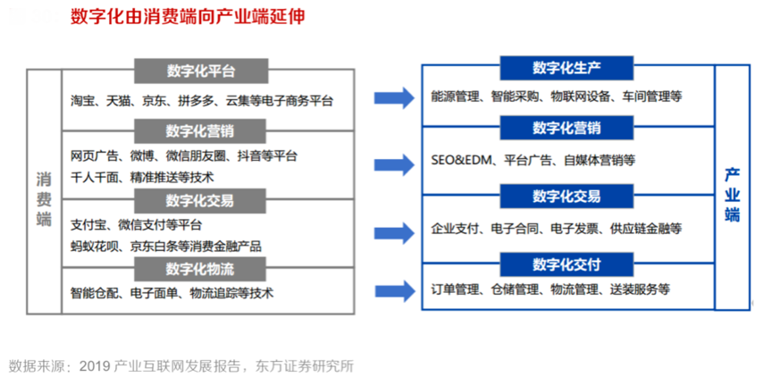 B2B產業互聯網的快速發展,與消費端、產業端等產業鏈環節的快速發展是密不可分的,關注產業消費的快速發展,推動B2B產業電商新零售的快速發展,是各B2B產業互聯網電商新零售平臺致勝市場的“不二法則”。根據《2019產業互聯網發展報告》、東方證券研究所等綜合資訊表明,數字化正驅動產業互聯網的快速發展,產業經營從消費端向產業端延伸日益成為“產業發展大勢”。