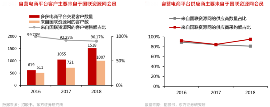 經典案例:根據公司招股說明書、東方證券研究所等綜合資訊表明,三大“多多”平臺在成立后的 2-3 年間,電商平臺的主要交易客戶,是建立在國聯資源網 10 余年積累的用戶基礎之上的。超過90% 的電商交易用戶直接來自于國聯資源網會員用戶的轉化。