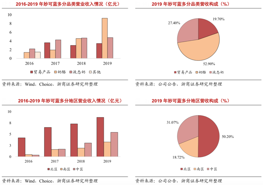 經典案例:根據公司公告、浙商證券研究所、wind、choice等綜合資訊表明,妙可藍多的奶酪產品貢獻主要營收,北部區域營收占比最大。2019 年,公司奶酪實現營收 9.21 億元,其公司北區實現營收 8.74 億元,同比+19.96%,營收占比 50.20%。