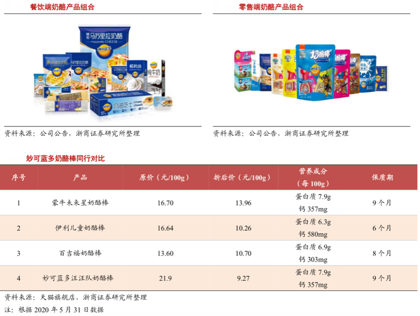 經典案例:根據公司公告、浙商證券研究所、天貓旗艦店等綜合資訊表明,妙可藍多2019 年奶酪板塊實現營收9.21 億(營收占比 53%),同比+102.20%。 零售端以奶酪棒為核心產品,即食奶酪系列采用卡通風格包裝、內藏益智問答游戲、開發多種口味(原味、混合水果味、巧克力味等)吸引兒童消費群體,其中明星產品奶酪棒 2019 年實現銷售收入 4.96 億元(占奶酪板塊營收 53.79%);餐飲端以馬蘇里拉奶酪為核心產品,加強芝士片、黃油、稀奶油產品開發,滿足客戶個性化和多樣化需求。