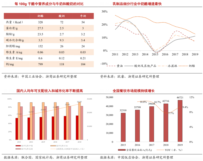 “乳品奶酪”的產品教育正在快速推進,“利基型消費者”正在形成,消費市場正在形成。根據中國工業協會、浙商證券研究所、國家統計局、歐睿等綜合資訊表明,隨著中國城鎮化率不斷提升,消費者追求更加高品質的蛋白質食品,奶酪高倍濃縮了牛奶中的營養成分,其蛋白質含量(每 100g 約含 25 克)是鮮奶(每 100g 約含 3 克)的8倍以上,被公認為“乳品之王,奶中黃金”。并且餐飲行業需求旺盛,也進一步地推動奶酪行業快速發展。