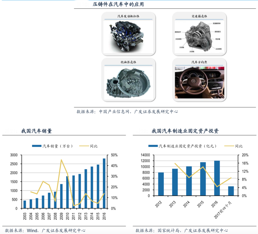 經(jīng)典案例:隨著汽車產(chǎn)銷量的不斷 增長,以及汽車材料越趨輕量化、環(huán)保化,汽車壓鑄件代替鋼鐵部件已成為行業(yè)趨 勢,為壓鑄機行業(yè)帶來持續(xù)的市場需求。根據(jù)中國產(chǎn)業(yè)信息網(wǎng)、廣發(fā)證券發(fā)展研究中心、wind、國家統(tǒng)計局等綜合資訊表明,2017年前四個月汽車制造業(yè)固定資產(chǎn)投資3241億元,同比增長 8.79%。汽車產(chǎn)銷量的增長促進汽車壓鑄件需求的增加。