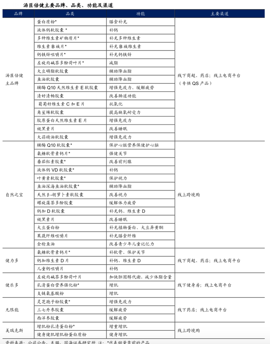 經(jīng)典案例:根據(jù)公司公告、天貓、國海證券研究所等綜合資訊表明,湯臣倍健以健力多、健樂多、無限能等多個(gè)品牌覆蓋線上電商、線下商超健身房間等多類終端,湯臣倍健主品牌銷售額占比90%以上,產(chǎn)品包含蛋白質(zhì)、維生素、心腦血管等16個(gè)分類,涵蓋了幾乎維生素/膳食補(bǔ)充劑市場的所有產(chǎn)品。