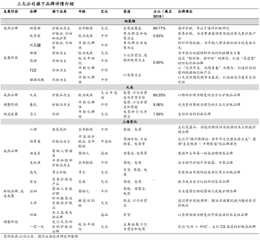 經典案例:根據公司公告、國信證券經濟研究所等綜合資訊表明,丸美三大品牌丸美、春紀和戀火個性突出,丸美和春紀目前主營護膚品,但分別定位中高端和大眾化,戀火則主營彩妝。截至 2018 年底,丸美、春紀和戀火品牌營收占比分別為 89.25%、9.06%和 1.69%。三大品牌各有自己的成熟品牌和發展品牌,價格分開,定位鮮明,品牌競爭格局大開。