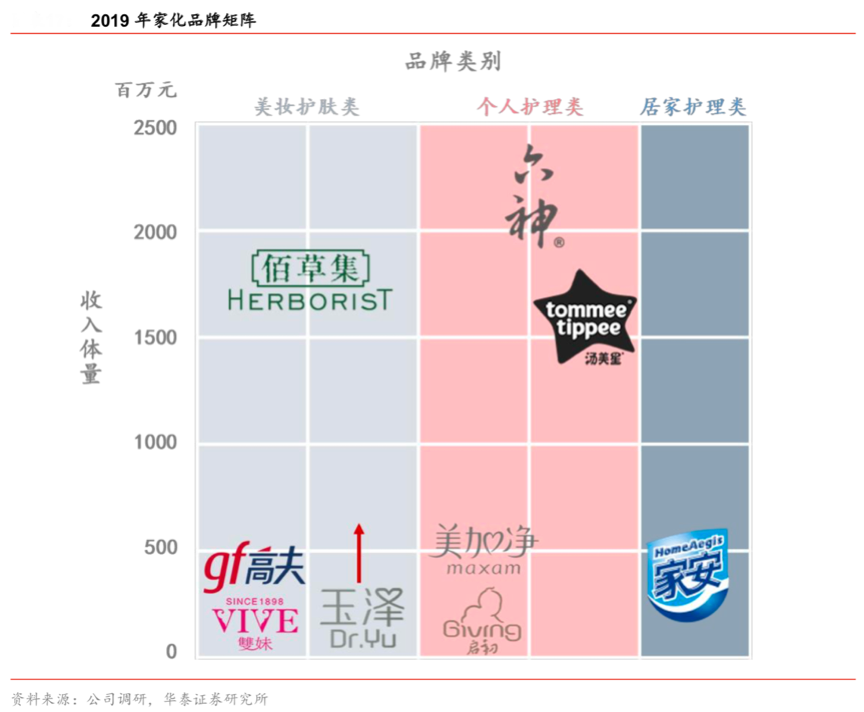 經典案例:根據公司調研、華泰證券研究所等綜合資訊表明,2019年的家化品牌矩陣實力強大,佰草集作為“國貨護膚中高端品牌”,歷史悠久,底蘊深厚, “玉澤”為醫研共創特色品牌,貼合當前功效性護膚需求,日益成為第二梯隊領軍品牌。