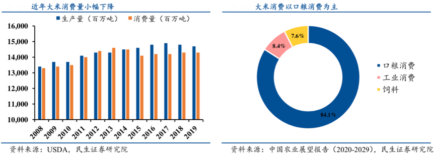 經典表現:根據USDA、民生證券研究院等綜合資訊表明,近年來大米消費量小幅下降,同時根據中國農業展望報告(2020-2029)、民生證券研究院等綜合資訊表明,2019 年我國大米口糧消費量為 1.14 億噸,占比消費總量的最大,而口糧消費中主要以散裝米為主,包裝米占比較低。