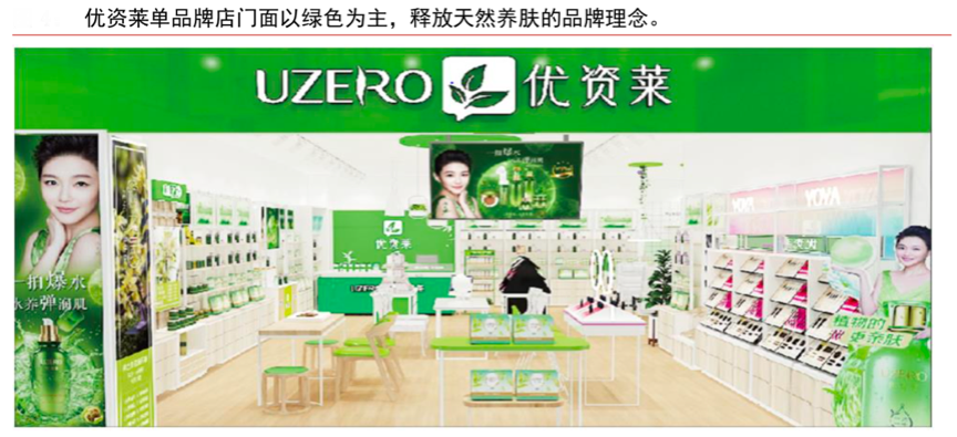 經(jīng)典案例:根據(jù)公司官網(wǎng)、東莞證券研究所等綜合資訊表明,優(yōu)資萊主打以茶為原料,主打“天然好茶, 茶養(yǎng)美肌”的護膚概念,2017 年起,優(yōu)資萊開始通過加 盟模式大力鋪設(shè)單品牌店,加強消費者對品牌形象的認知。