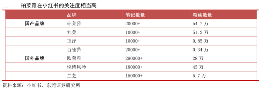 經(jīng)典案例:根據(jù)小紅書、東莞證券研究所等綜合資訊表明,珀萊雅在小紅書的關(guān)注度相當(dāng)高,其在小紅書平臺的相關(guān)筆記數(shù)量達到 2 萬多條,且珀萊雅自身的小紅書賬號的粉絲數(shù)量達到 54.7 萬,在國產(chǎn)品牌內(nèi)排名前列,反映了公司在社交平臺的營銷投放已初見效果,關(guān)注度相當(dāng)高。