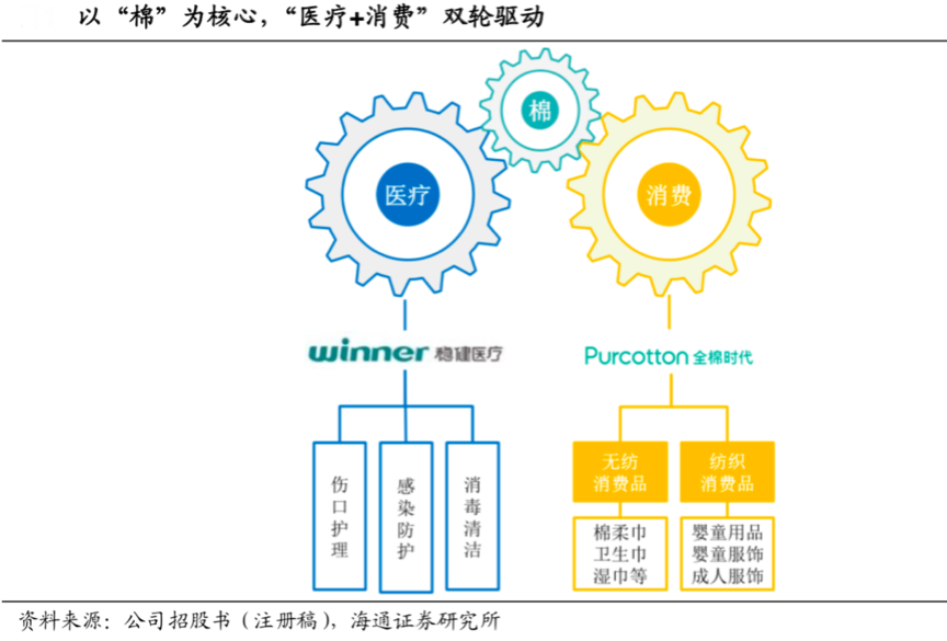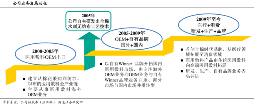 經(jīng)典案例:根據(jù)公司招股說明書、海通證券研究所等綜合資訊表明,穩(wěn)健醫(yī)療以起步于紗布、棉簽等醫(yī)用敷料,2005 年自主研發(fā)出舒適、安全、環(huán)保的全棉水刺無紡布,2009 年成立“Purcotton 全棉時代”品牌并推出純棉柔巾等代表性產(chǎn)品,成功實現(xiàn)醫(yī)用產(chǎn)品向家用產(chǎn)品的拓展。其以“品牌全域化發(fā)展”引領著行業(yè)潮流。