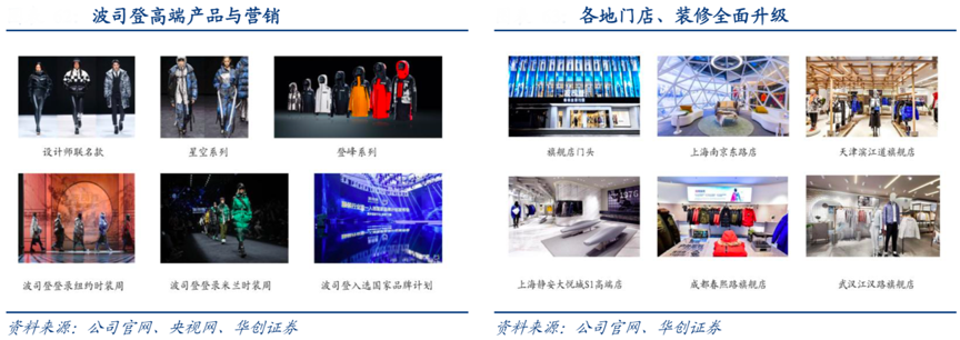 經(jīng)典案例:根據(jù)公司官網(wǎng)、央視網(wǎng)及華創(chuàng)證券等綜合資訊表明,波司登聯(lián)合優(yōu)質(zhì)公司及設(shè)計(jì)師資源升級(jí)門店形象及店鋪陳列,以“千店換門頭”升級(jí)品牌 logo,店內(nèi)裝潢全面升級(jí),紅地毯、視頻宣傳、專賣店統(tǒng)一裝修風(fēng)格、飲水機(jī)、雜志等相關(guān)服務(wù)全面提升品牌化的門店體驗(yàn),并于2018 年入選國家品牌計(jì)劃。