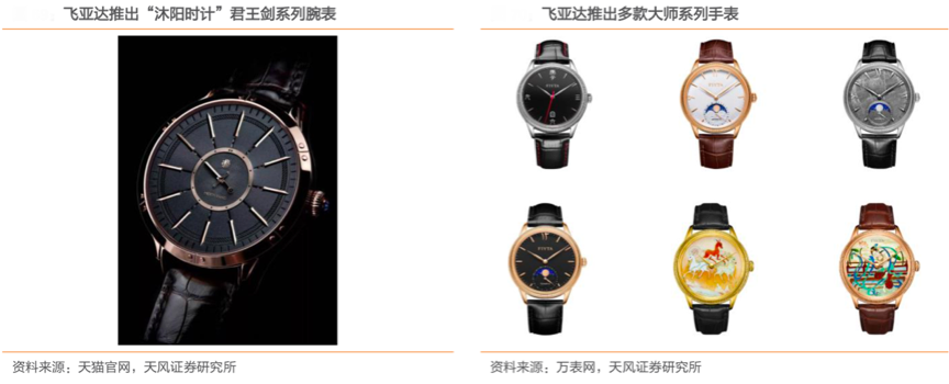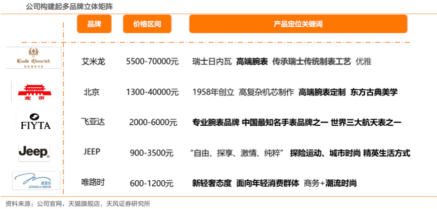 經(jīng)典案例:根據(jù)公司官網(wǎng)、天貓旗艦店、天風(fēng)證券研究所等綜合資訊表明,飛亞達(dá)旗下品牌覆蓋高端、中端及輕奢,傳統(tǒng)美學(xué)及城市時(shí)尚,國(guó)產(chǎn)及海外品牌,面向多元消費(fèi)群體,“多品牌立體矩陣”日益突出。