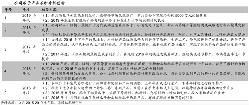經典案例:根據公司年報、海通證券研究所等綜合資訊表明,2017年,洽洽食品對傳統產品紅袋瓜子系列進行了原料、生產工藝、外包裝進行了優化升級,從口感和質感上均進行升級,消費體驗明顯提升。同時加大力氣開展賦予藍袋系列更多的產品內涵,提升了品類組合競爭力。