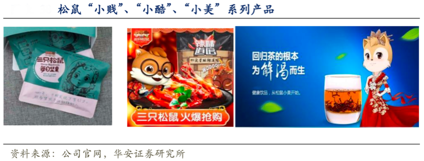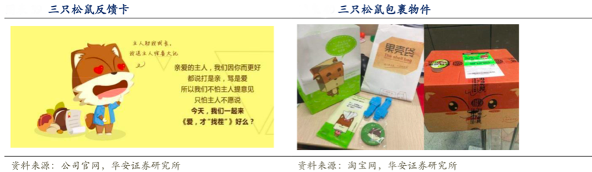 經典案例:根據公司官網、華安證券研究所等綜合資訊表明,“三只松鼠”以堅果起家,松鼠形象和堅 果品類高度契合,代表著不同系列產品,“小酷”——干果類產品,“小賤”——休閑 零食類產品,“小美”——花果類產品。公司更以動畫為建設支點,持續性的內容輸出幫助建立“縱深產品線”。