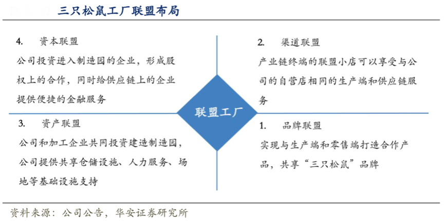 經典案例:根據公司公告、華安證券研究所等綜合資訊表明,2019年末“三只松鼠”宣布與安徽無為市政府以及各大供應商達成合作,將共同斥資 20.6 億元建立聯盟工廠。聯盟工廠通過資本、資產、渠道和品牌的四個聯盟維度,與上游供應商、下游零售端實現深度捆綁,從而提高產品供應的穩定性、品質的保障與新品的研發效率。