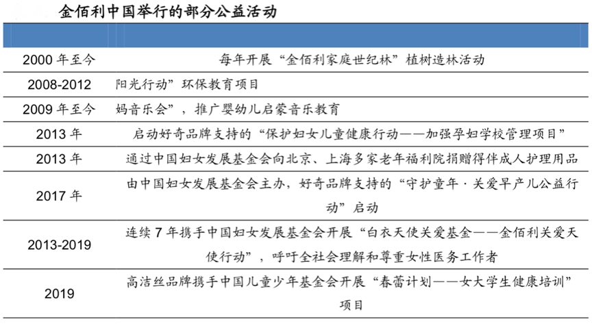 經典案例:根據公司官網、廣發證券發展研究中心等綜合資訊表明,以金佰利中國為例,其與中國婦女發展基金會、中國兒童少年基金會多次合作公益項目,惠及到準媽媽、女性醫務工作者、女大學生、福利院老人等受眾群體。公益形象的提升無形中擴大了品牌的知名度和美譽度。