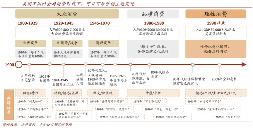 經典案例:根據公司官網、中金公司研究部等綜合資訊表明,可口可樂的營銷主題(即其品牌傳播)多是基于人均GDP現狀,根據消費者飲料消費從大眾消費向品質消費、理性消費等進化的狀況而有效制訂的,前期重點強調產品口味、正宗產品、可樂情懷等,中后期向個性情感、快樂精神及愉悅生活發展。