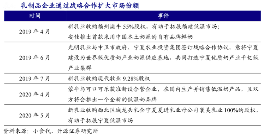 經(jīng)典案例:根據(jù)小食代、開(kāi)源證券研究所等綜合資訊表明,乳制品企業(yè)往往通過(guò)戰(zhàn)略合作、兼并收購(gòu)實(shí)現(xiàn)上下游資源整合,實(shí)現(xiàn)擴(kuò)張。如新乳業(yè)于 2019 年收購(gòu)了福州澳牛 55%股權(quán)及現(xiàn)代牧業(yè) 9.3%股權(quán),于 2020 年收購(gòu)寧 夏夏進(jìn)乳業(yè)母公司寰美乳業(yè)100%的股權(quán);光明乳業(yè)于 2019 年與中衛(wèi)市政府、寧夏農(nóng)業(yè)投資集團(tuán)簽訂戰(zhàn)略合作協(xié)議,意將寧夏建設(shè)為世界級(jí)優(yōu)質(zhì)奶產(chǎn)業(yè)奶源供應(yīng)基地。