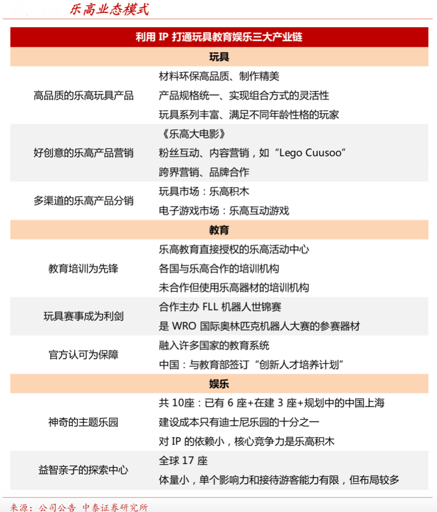 經典案例:根據公司公告、中泰證券研究所等綜合資訊表明,樂高通過“強大品牌IP”打通玩具教育娛樂三大產業鏈。其既擁有高品質的玩具產品和一系列的媒體營銷,又一方面通過活動和培訓中心來拓展教育業務,另一方面與官方合作,融入許多國家的教育體系和國際比賽;并以“樂高主題樂園”和“親子探索中心”點亮用戶體驗感,“快樂”的品牌形象深入人心。