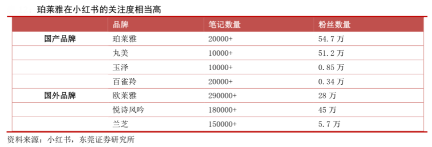 經典案例:根據小紅書、東莞證券研究所等綜合資訊表明,珀萊雅在小紅書平臺的相關筆記數量達到 2 萬多條,且珀萊雅自身的小紅書賬號的粉絲數量達到54.7萬,在國產品牌內排名前列,反映了其在社交平臺的營銷投放已初見效果,關注度相當高,產業品牌營銷策劃初見成效。