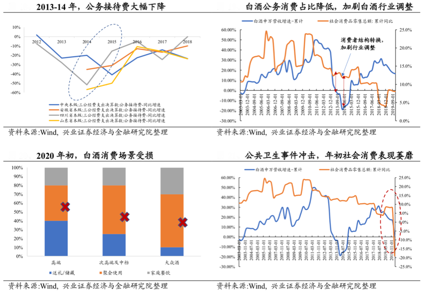 經(jīng)典案例:根據(jù)wind、興業(yè)證券經(jīng)濟與金融研究院等綜合資訊表明,消費者社會結構、飲食偏好等變量的變動會對白酒消費產(chǎn)生巨大沖擊。例如,2013-2014 年行業(yè)增速下行幅度大于社零增速下行幅度,限制“三公”消費導致的消費者群體變化加劇了白酒行業(yè)的調整; 如2020年初,公共衛(wèi)生事件沖擊之下消費者安全意識提升,消費沖動受到抑制,社會整體消費及白酒消費均呈現(xiàn)萎靡狀態(tài)。