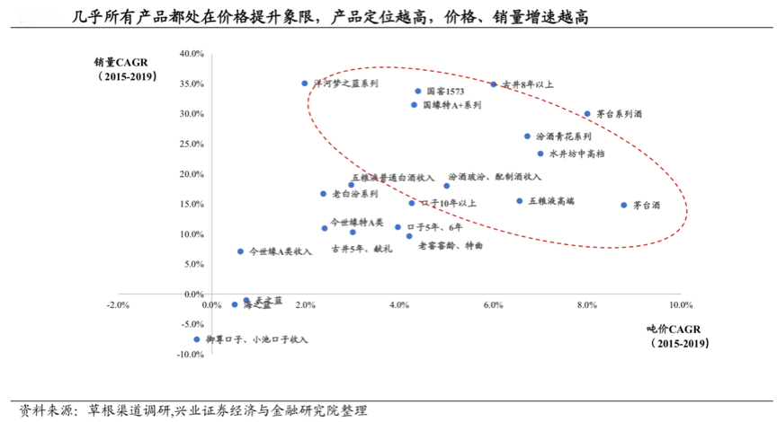 經(jīng)典案例:根據(jù)草根渠道調研、興業(yè)證券經(jīng)濟與金融研究院等綜合資訊表明, 2015年以來,名酒旗下單品的價格定位,噸價漲幅及銷量漲幅呈現(xiàn)明顯正相關。根據(jù)統(tǒng)計,各酒企的高端及次高端單品明顯處于量、價齊升的趨勢,而中檔以下單品更多呈現(xiàn)量穩(wěn)價穩(wěn)的狀態(tài)。白酒消費更多依賴價格端驅動,高定位單品更易進入量、價齊升區(qū)間。