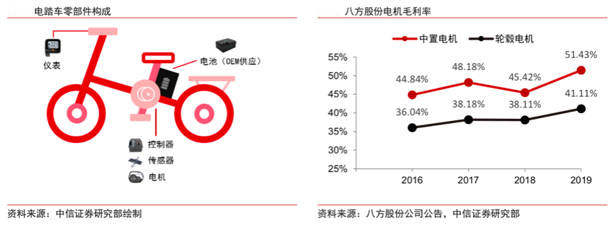 經(jīng)典案例:根據(jù)中信證券研究部、八方股份公司公告等綜合資訊表明,而電踏車相對(duì)于電動(dòng)自行車,增量零部件主要是控制器、傳感器,包括傳感器、儀表和其他套件。包括電機(jī)、 控制器、傳感器在內(nèi)的電踏車電助力系統(tǒng)是電踏車產(chǎn)業(yè)鏈中毛利率最高的環(huán)節(jié),例如,八方股份生產(chǎn)的輪轂電機(jī)電助力系統(tǒng)毛利率超過(guò) 40%,中置電機(jī)更是超過(guò) 50%。