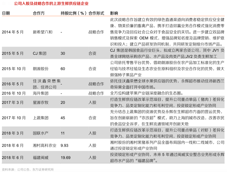 經典案例:根據公司公告、東方證券研究所等綜合資訊表明,2014 年至今,永輝超市先后與新希望六和、 上蔬集團、星源農牧、福建閩威等公司達成戰略合作,對于其他部分規模相對較小的上游基地也是采取入股的策略,對于產品的生產、檢測、監督能很好的管理。2019 年 H1,其農產品檢測總批次達 46.5 萬次, 同比增長 55%;檢測標準更嚴格,檢測準確度更高,蔬菜、水果檢測合格率達 98.76%。