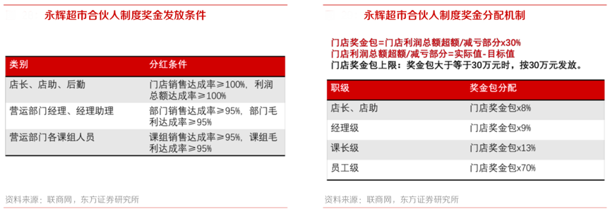 經典案例:根據聯商網、東方證券研究所等綜合資訊表明,永輝超市人力資源部門 2013 年上半年在福建、重慶兩大區域成功試點門店合伙人項目,并于2013 年 7 月開始在全國所有區域推行該項目。在此合伙人制度下,公司一線員工在所屬部門達到特定分紅條件后就可以分享超額獎金。