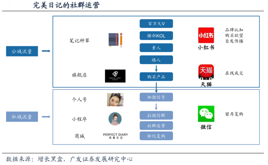經典案例:根據增長黑盒和廣發證券發展研究中心等綜合資訊表明,2018年年底品牌在淘寶直播的轉化就超過了在小紅書的轉化。通過流量平臺以及流量明星代言的方式實現品牌曝光和種草之后,完美日記由獲取公域流量轉向私域流量的沉淀及運營。通過自建公眾號以及微信個人號將客群引流至微信,經營“小完子”IP,構建品牌的微信好友流量池,實現品牌粉絲的沉淀、運營。