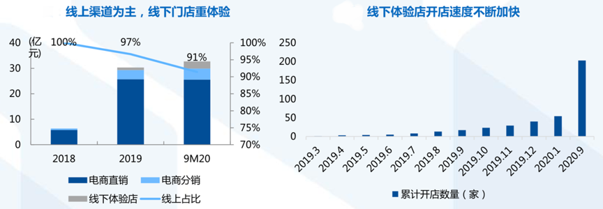 經典案例:根據逸仙電商招股說明書、增長黑盒和國泰君安證券研究等綜合資訊表明,完美日記線上渠道主要包括天貓、京東、唯品會等電商平臺以及微信、抖音、快手、小紅書、嗶哩嗶哩等社交平臺,線下門店致力于打造沉浸式的試妝體驗,增強與消費者的互動感。2020年前三季度,公司線上直銷收入達25.6億元、同比增長 56%;線上平臺分銷收入達4.3億元、同比增長104%;線下收入達2.8億元、同比增長176%。截至9月底,其已在中國90多個城市開設了200余家線下體驗店,多位于高線級城市購物商圈。