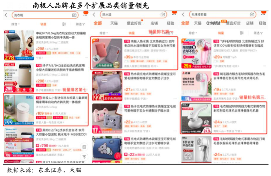 經(jīng)典案例:根據(jù)東北證券、天貓等綜合資訊表明,南極人品牌涉及產(chǎn)品已涵蓋內(nèi)衣、家紡、居家布藝、女裝、男裝、童裝、母嬰、生活小電器、居家日用、鞋品、運(yùn)動(dòng)戶外等多個(gè)類目,而在阿里平臺(tái)搜索關(guān)鍵詞顯示,南極人品牌在洗衣 機(jī)、熱水袋、毛球修剪器等多個(gè)細(xì)分類目銷量領(lǐng)先。