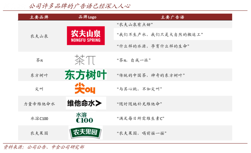 經(jīng)典案例:根據(jù)公司公告、中金公司研究部等綜合資訊表明,農(nóng)夫山泉的許多廣告語已經(jīng)深入人心,除產(chǎn)品本身特性外,公司亦致力于向消費者傳遞品牌的精神和主張。