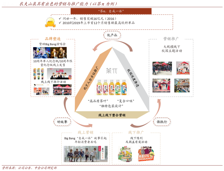 經(jīng)典案例:根據(jù)公司公告、中金公司研究部等綜合資訊表明,茶 π 日益成為年輕消費者心目中的標志性品牌,在推出的當年,茶 π 為公司帶來的收入即突破 16 億元。根據(jù)沙利文的報 告,茶 π 也成為 2010 至 2019 年 10 年中上市首 12 個月零售額最高的中國飲料新品。